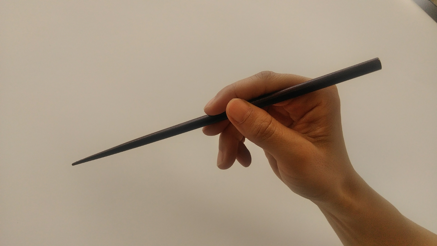 まずは鉛筆を持つ形をイメージして、親指と人差し指、中指で箸をやさしく持ちます。この持ち方が箸の上側になります。