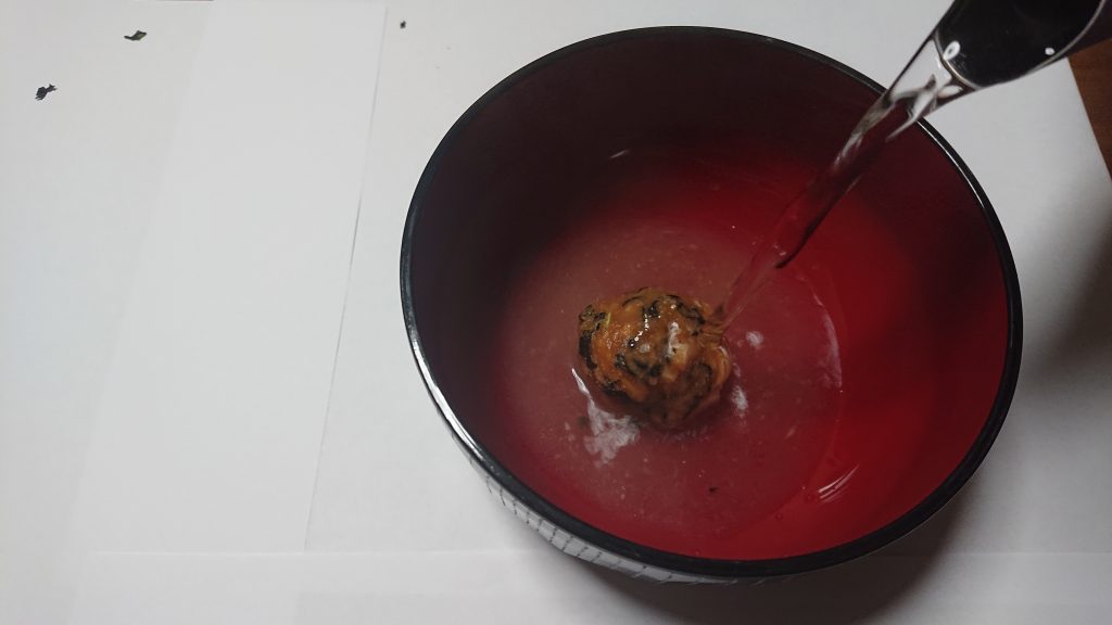 この味噌玉をお椀に入れ、お湯を適量注いでよく混ぜると味噌汁が完成します。このときにお湯の代わりに鰹節でとっただし汁を使うとより風味が出ておいしくなります。
