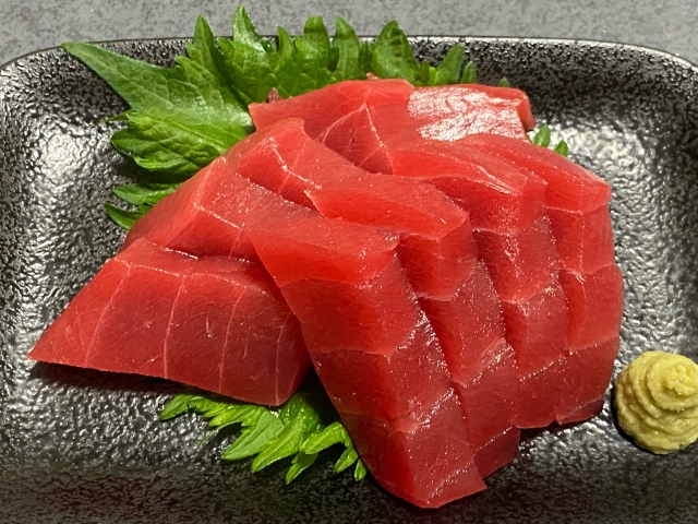 マグロやカツオ等の赤身魚は、身が柔らかく大きく厚いので、薄く切ると歯ごたえが弱まります。赤身魚の身の弾力を楽しむために切り身に厚みの出る平造りが用いられます。