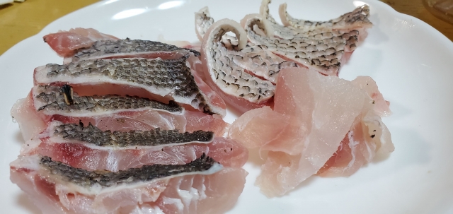 皮に旨みがあるとされる、タイやイサキ等の魚に用いられる手法です。魚の皮を引いていない状態で熱を通し、冷水で冷まし、切り身を切っていく方法です。