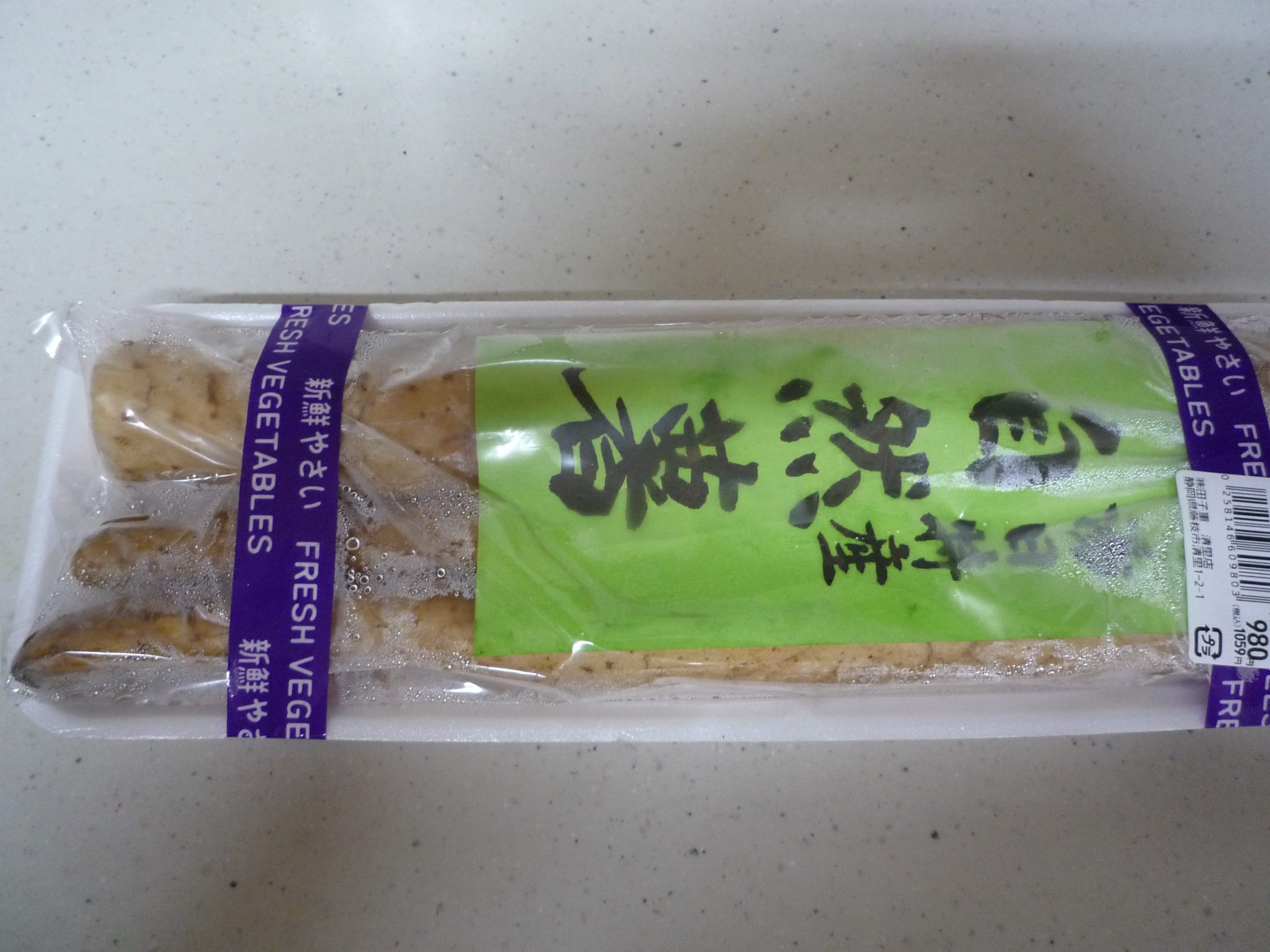 まずはこれら4種類を見分けられるようにしたいと思いました。そこで実際にスーパーを回り、購入した各々の芋を、芋の形とスーパーではどう表示されているのかの両方が分かるように、パックされたままの状態で写真を撮りました。元来自生する種類の自然薯は栽培に手間がかかる(非常に長くなるので土中に筒を埋めてそこに通す)のが要因なのか、入荷しにくいらしく5店目のスーパーでやっと購入できました。